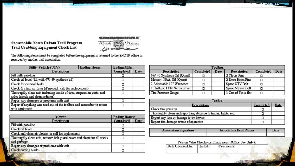 › The club transferring the equipment to another club must complete the Trail Grubbing Equipment Check List form and provide it to the reserving office