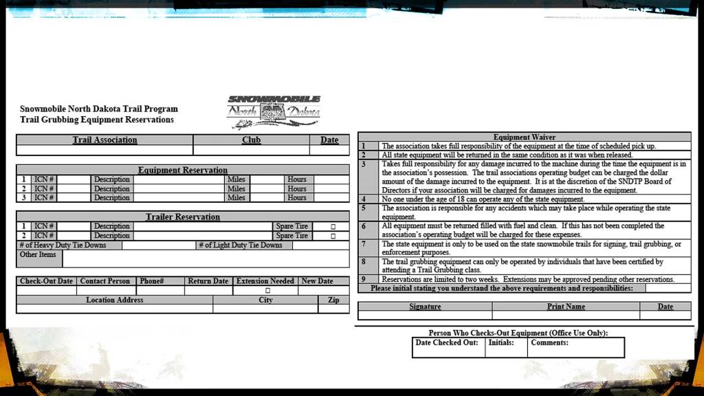 › The club transferring the equipment to another club must complete the Trail Grubbing Equipment Check List form and provide it to the reserving office